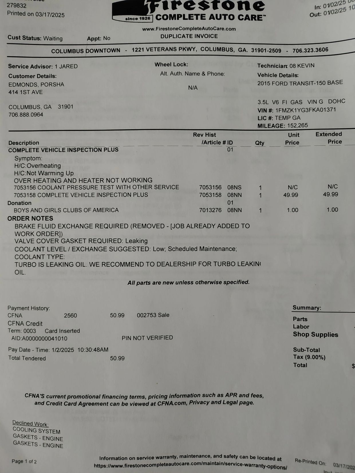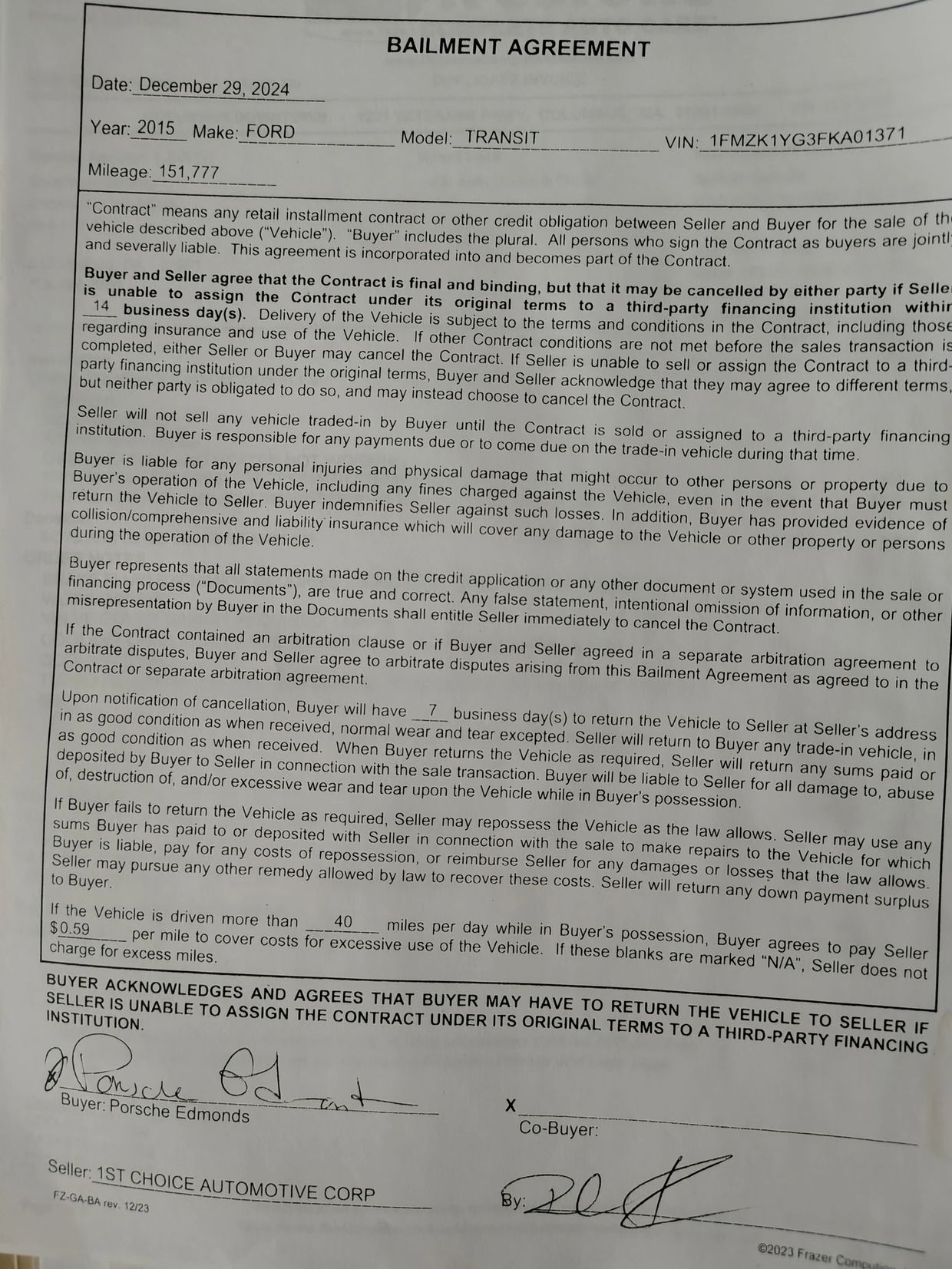 I called 1st choice auto and I told them what had occurred, I told them I was referred to go to the dealership because they didn't do turbos, 1st choice auto said go to the dealership and see what they can do. When I got to the dealership I called first choice and told them the dealership wasn't able to service first day and I had an appointment me they said okay, call us and let us know what they said. After the appointment I called 1st choice and I asked would they send funding for the repairs or do they prefer me to return the vehicle, he said give me 2 days I have to speak to the owner, Gabriel never called after the two days, I called Gabriel and he told me they wouldn't take the vehicle back and they wouldn't cover the repairs either. Leaving me a 938 monthly note and 6,000 in damages of repairs. The vehicle was repossessed, I did fix the damages out of pocket, but soon as it was fixed the Catalytic converter needed to be replaced as well, my bills were behind and I was unable to upkeep the bill and the van was repossessed.